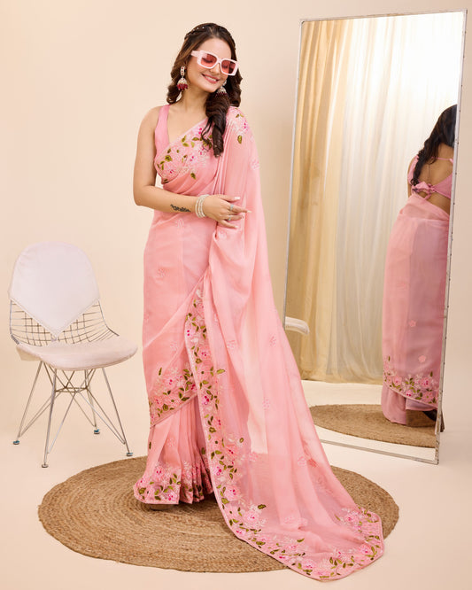 Amazing Powder Pink Color Party Wear Designer Saree.