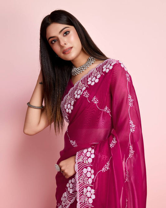 Wedding Function Special Embroidery Work Organza Silk Saree Collection.