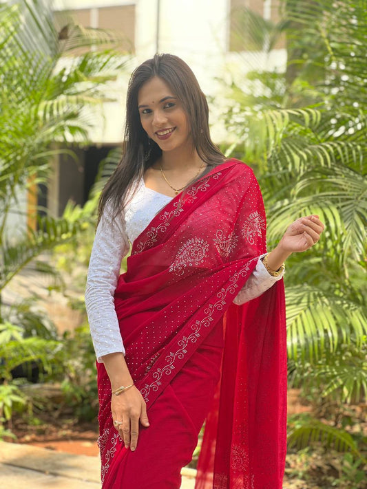 Beautiful Tie & Die Sareen In Traditional Red Colour.
