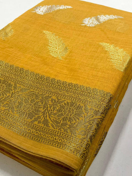 Haldi Occasions Special Look Premium Cotton Silk Mustard Yellow Color Saree.
