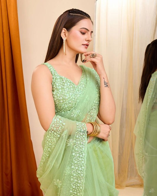 Beautiful Party Wear Designer Pista Soft Butterfly Net Saree.