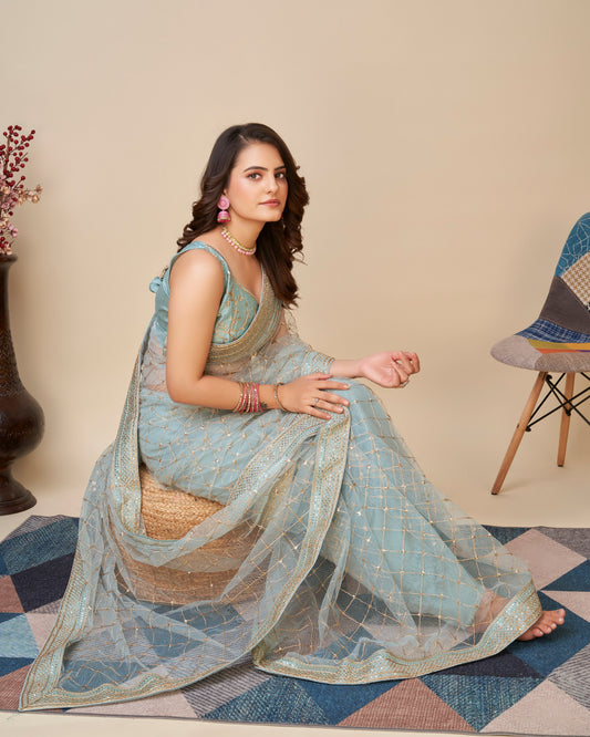 Premium Designer Soft Butterfly Net Sky Blue Saree.