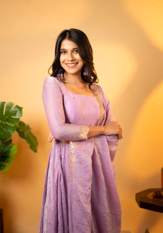 Beautiful Party Wear Pure Gold Crush Silk Lavender Gown Collection.