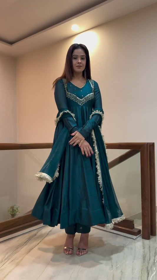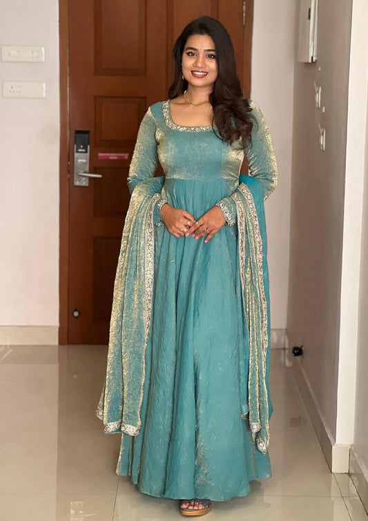 Latest Trendy Roman Silk Chanderi Pista Gown Collection.