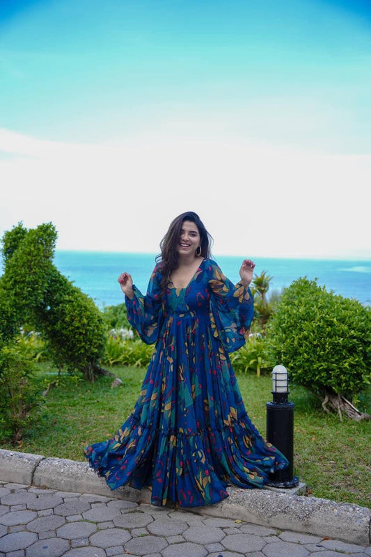 Pure Soft Faux Georgette Floral Printed Flaired Gown.