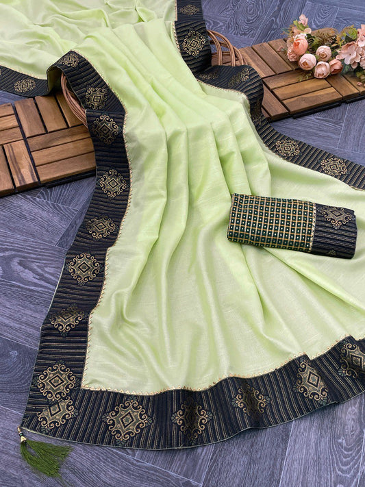 Beautiful Pista Color Vichitra Cotton Saree Collection.