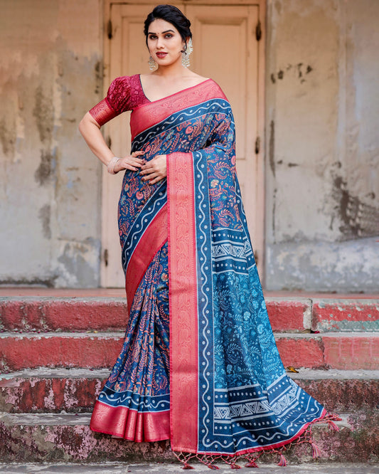 Occasions Wear Special Traditional Impressive Look Pure Silk Digital Printed Blue Saree.
