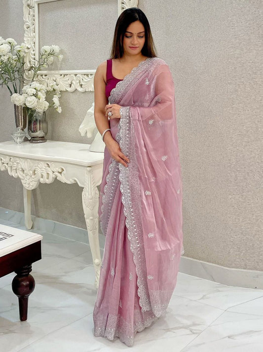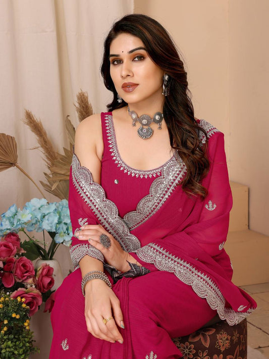 Soft Zomato Chiffon Silk With Silver codding Sequence Embroidery Work Pink Saree.