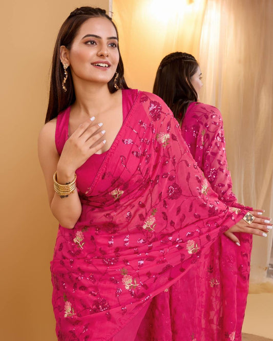 Party Wear Designer Pink Color Premium Soft Zimmy Chu Silk Saree.