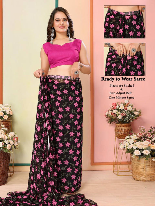 Classic Look Hot Pink Black Shade Georgette 1-Minute Ready To Wear Special Saree.